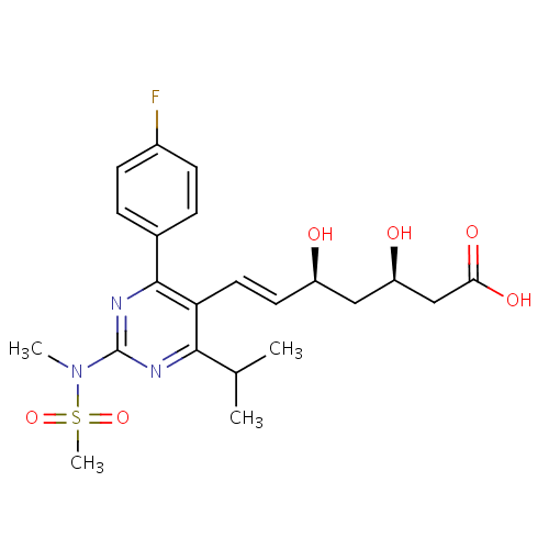 Mechanism of action Rosuvastatin is a competitive inhibitor of HMG-CoA reductase. HMG-CoA reductase catalyzes the conversion of HMG-CoA to mevalonate, an early rate-limiting step in cholesterol biosynthesis. Rosuvastatin acts primarily in the liver. Decreased hepatic cholesterol concentrations stimulate the upregulation of hepatic low density lipoprotein (LDL) receptors which increases hepatic uptake of LDL. Rosuvastatin also inhibits hepatic synthesis of very low density lipoprotein (VLDL). The overall effect is a decrease in plasma LDL and VLDL. In vitro and in vivo animal studies also demonstrate that rosuvastatin exerts vasculoprotective effects independent of its lipid-lowering properties. Rosuvastatin exerts an anti-inflammatory effect on rat mesenteric microvascular endothelium by attenuating leukocyte rolling, adherence and transmigration (PMID: 11375257). The drug also modulates nitric oxide synthase (NOS) expression and reduces ischemic-reperfusion injuries in rat hearts (PMID: 15914111). Rosuvastatin increases the bioavailability of nitric oxide (PMID: 11375257, 12031849, 15914111) by upregulating NOS (PMID: 12354446) and by increasing the stability of NOS through post-transcriptional polyadenylation (PMID: 17916773). It is unclear as to how rosuvastatin brings about these effects though they may be due to decreased concentrations of mevalonic acid.